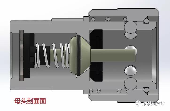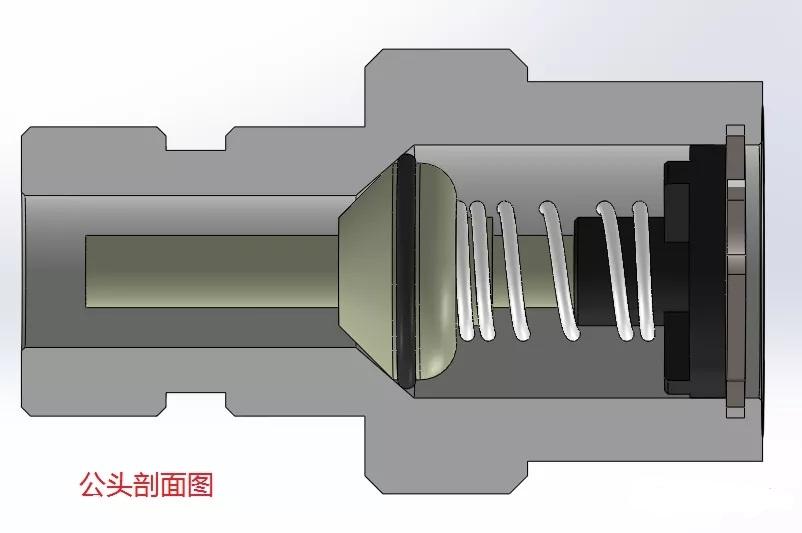 公頭未與母頭裝配時閥芯在彈簧力的作用下保持封閉,管路不通。公頭一般以螺紋連接的方式固定在閥板上,閥板中的螺紋孔需加密封圈保持密封。